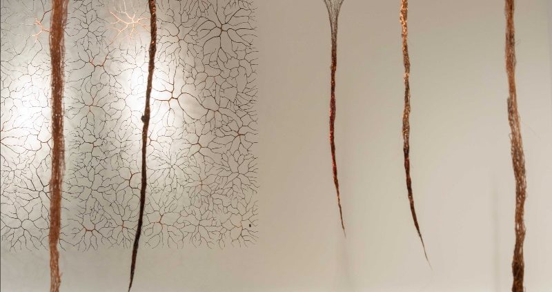 The souls of these places (anima locus) form the core of this exhibition, in which Hals shows her most recent works, made from various types of metal and fibers. Chosen for their intrinsic beauty, Hals composes with materials from recycling sites or objects found on the beach or on the roadside, such as the reddish copper wire of electrical cables, the ring-pulls of beer cans, a fragment from a clock, or a piece of plastic jewelry… The artist weaves, knits and hammers these so-called poor materials delicately like a goldsmith, transforming them into refined grids, vibrating sculptures, poetic dream-catchers. Through her delicate yet powerful works, this ‘artist-alchemist’ shares with us her personal wonder at metamorphosis, whether it is a material that she transfigures from waste into art, or a culture she elevates from low into high, all the while maintaining a trace of its original state.