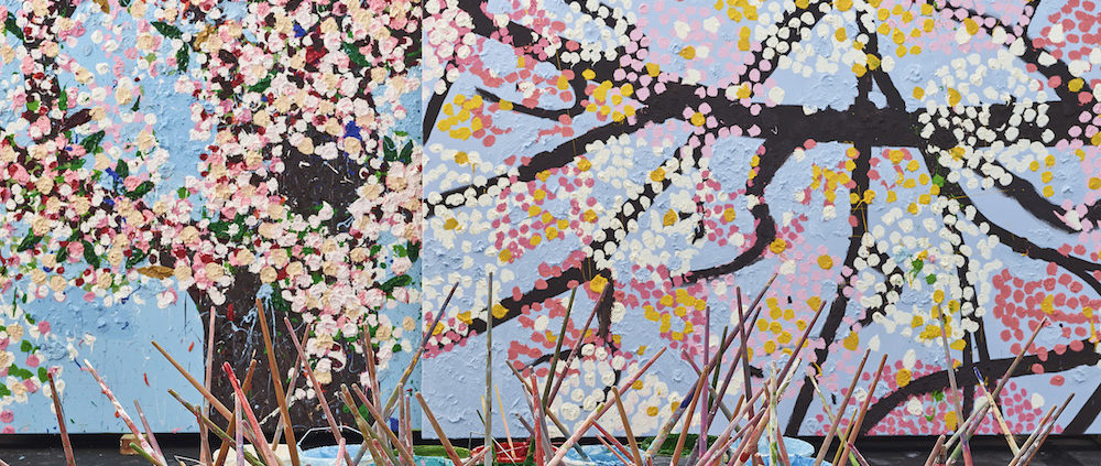 « Cherry Blossoms parle de beauté, de vie et de mort. Ces peintures sont excessives — presque vulgaires. Comme Jackson Pollock tourmenté par l’amour. Elles sont décoratives bien que directement inspirées de la nature. Elles parlent de désir, de la manière dont on perçoit les choses qui nous entourent et ce qu’on en fait, mais évoquent aussi l’incroyable et éphémère beauté d’un arbre en fleurs dans un ciel sans nuages. J’ai adoré travailler sur ces toiles, me perdre entièrement dans la couleur et la matière à l’atelier. Les Cherry Blossoms sont tape-à-l’œil, chaotiques et en même temps fragiles, c’est grâce à elles je me suis éloigné du minimalisme, du fantasme d’un peintre mécanique. Et c’est ça que j’ai vraiment trouvé excitant. »