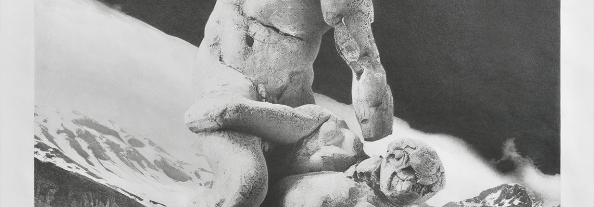 La série de dessins De Sphaera mundi confronte des planisphères du XIIe siècle tirés de La théorie des planètes de Gérard de Crémone aux images d’une comète observée par la sonde spatiale Rosetta ; les cartographies médiévales se téléscopent à la plus récente technologie spatiale. Les trois grands dessins réalisés s’inspirent d’une sculpture de Michel-Ange, datée d’environ 1530 et très abîmée par le temps, représentant le combat le combat d’Hercule contre Cacus. Dans les œuvres de Jean Bedez, le grand Hercule, faisant mordre la poussière à Cacus, redevient poussière lui-même. Son bras droit, celui même qui tient son arme fétiche, a disparu. La ruine le gagne, lumière et ténèbres s’affrontent dans un paysage chaotique. C’est cet Héraclès, abîmé, fragile, qu’évoque Jean Bedez, du moins son aptitude médiocre à parvenir jusqu’à nous intègre, fidèle à lui-même, propriétaire sans concession de la puissance inouïe qui lui était échue. Mais la mythologie n’est pas la seule affaire de l’artiste, chaque motif est chez lui l’écho d’une réalité alchimique, astrophysique, politique, poétique, ésotérique. C’est ce que donnent à voir ses œuvres, détails d’une cosmogonie infinie et labyrinthe qui n’en est qu’à ses débuts.